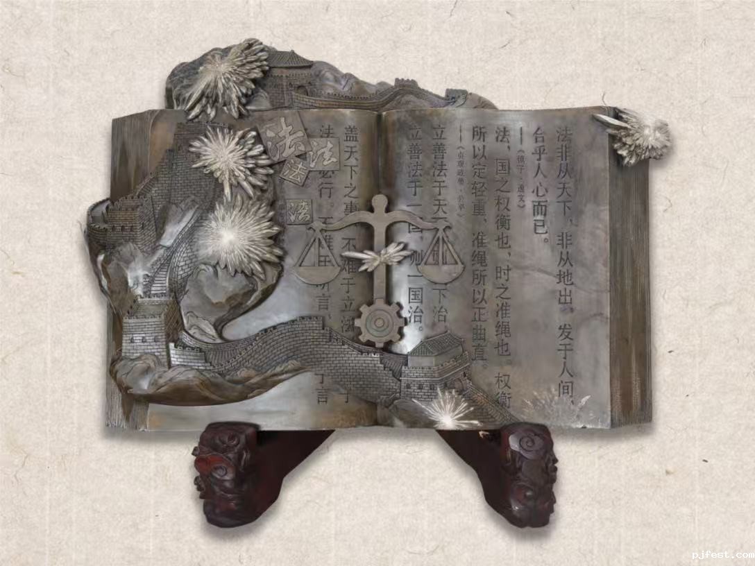 “《法韵菊华》以书本造型为整体设计,象征着法律是维护社会秩序和公正的基石。”浏阳市司法局相关负责人介绍,《法韵菊华》将法律天秤设计于核心位置,石面中心重点雕刻法治名句,左侧蜿蜒的长城象征中国,天然的菊花纹理巧妙地置于法律天秤的中间,寓意着法律与自然、公正、美好的和谐统一。